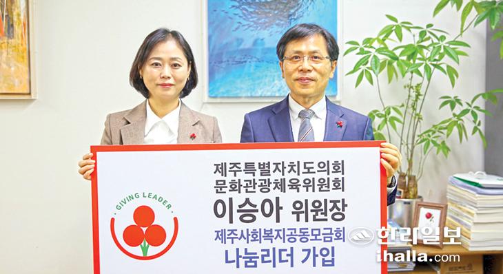 이승아 제주특별자치도의회 문화관광체육위원장은 3일 제주도의회 의원실에서 제주사회복지공동모금회(회장 강지언)가 진행하는'제주 나눔리더'에 2023년도 첫 번째로 가입하고 지역사회 나눔문화 확산에 앞장서기로 했다. 이승아 위원장이 기부한 제주사회복지공동모금회 나눔리더 성금은 전액 도내 복지사각지대 발굴과 지원에 사용될 예정이다.