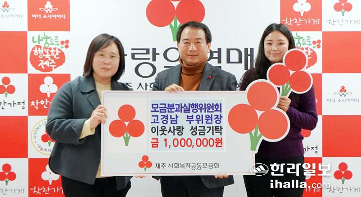 제주사랑의열매 모금분과실행위원회 고경남 부위원장은 지난 2일 제주사회복지공동모금회(회장 강지언)를 방문해 이웃사랑 성금 100만원을 기탁했다. 이날 전달된 성금은 도내 복지사각지대에 사용될 계획이다.