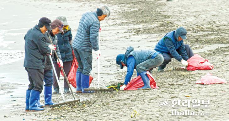3일 제주시 이호해수욕장에서 바다환경지킴이들이 해양정화활동을 하고 있다. 강희만기자