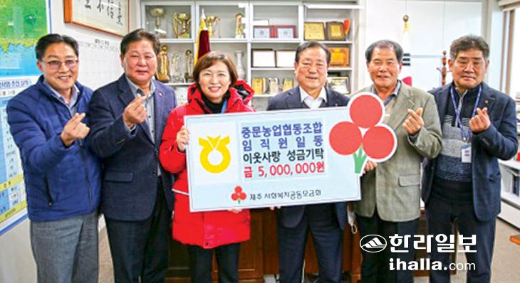 중문농협(조합장 김성범) 임직원은 지난 2일 중문농협 본점에서 제주사회복지공동모금회(회장 강지언)에 성금 500만원을 기탁했다. 김성범 조합장은 "앞으로도 지역사회와 상생하며 지속적인 나눔활동을 이어갈 수 있도록 노력하겠다"고 말했다.