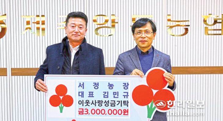 서정농장 김민규 대표는 최근 제주양돈농협 회의실에서 제주사회복지공동모금회(회장 강지언)에 이웃사랑 성금 300만원을 기탁했다. 성금은 지역 내 저소득가정 및 위기가구에 생계비 및 의료비 등으로 지원될 예정이다.
