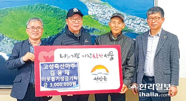 고성축산마주(마주 김용재)는 지난 3일 서귀포시 성산읍(읍장 현동식)을 방문해 새해를 맞아 지역사회의 어려운 이웃을 위해 사용해달라며 성금 300만원을 기탁했다.