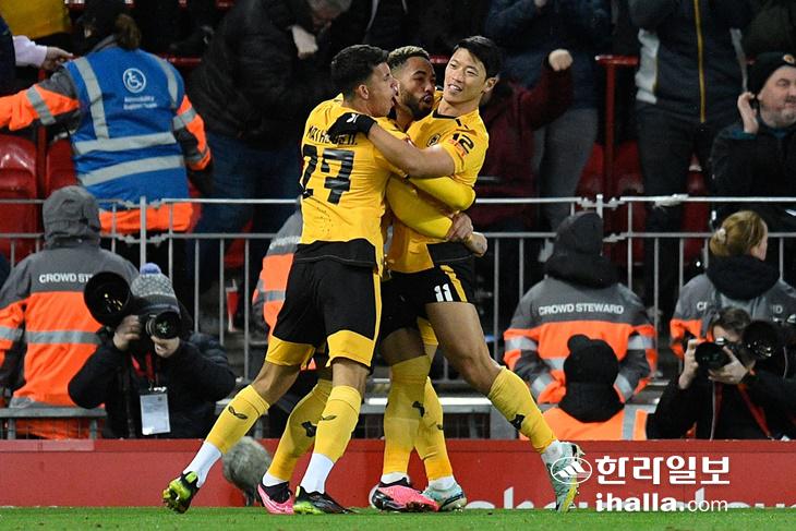 8일 2022-2023 잉글랜드축구협회(FA)컵 리버풀과 3라운드(64강)경기에 골을 넣은 후 동료들과 기쁨을 나누는 황희찬. 연합뉴스