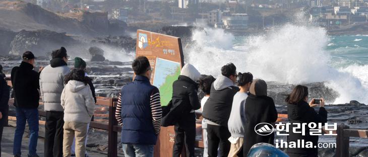 7일 제주시 애월읍 구엄리 돌염전을 찾은 관광객들이 높은 파도를 배경으로 기념사진을 찍으며 제주에서의 추억을 새기고 있다. 이상국기자
