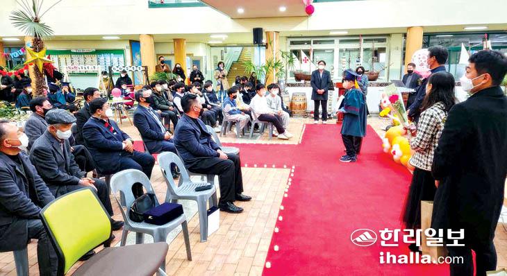 우도초등학교(교장 이강식)는 지난 5일 우도초등학교병설유치원 제41회 졸업식, 우도초등학교 85회 졸업식, 우도중학교 제67회 졸업식을 통합해 2022학년도 우도 유·초·중 통합 졸업식을 개최했다. 이날 졸업식에서 초등학교 졸업생 9명에게 1인당 50만원, 중학교 졸업생 7명에게 1인당 60만원의 장학금이 전달됐다.