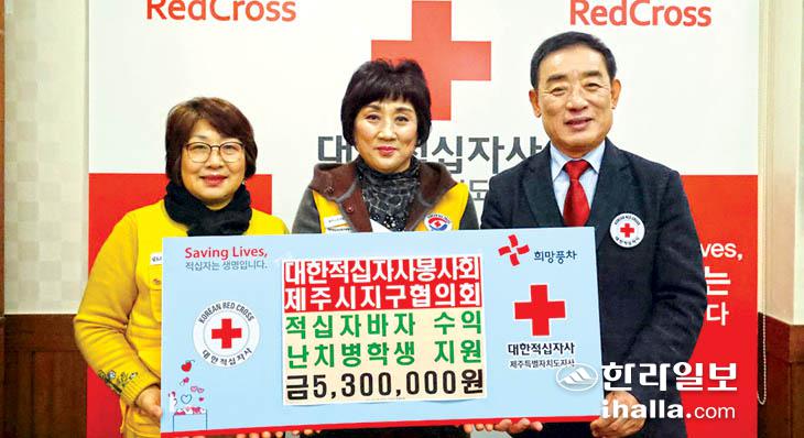 대한적십자사봉사회 제주시지구협의회(회장 고영자)는 지난 6일 대한적십자사제주특별자치도지사(회장 오홍식)를 방문해 난치병 학생을 돕는 데 써달라며 성금 530만원을 기탁했다. 이번 성금은 지난 10월 적십자 바자회에서 봉사회가 각종 물품을 판매한 수익금으로 마련됐으며 적십자사는 생계가 어려운 난치병 학생을 지원하는 데 성금을 사용할 예정이다.