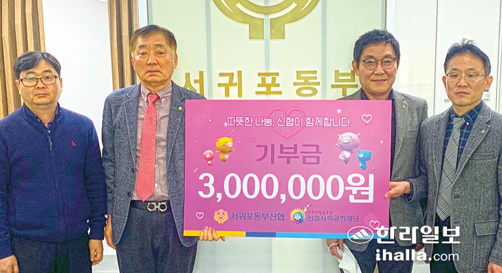 서귀포동부신협(이사장 현학열)은 지난 9일 신협사회공헌재단(이사장 김윤식)에 성금 300만원을 전달했다. 이날 전달된 기부금은 신협사회공헌재단을 통해 도움이 필요한 도내 사회적 취약계층 지원을 위해 사용될 예정이다. 현학열 이사장은 "지역 내 어려운 이웃들을 위해 기부금을 전달하게 됐다"며 "매년 다양한 나눔 활동으로 지역사회에 환원하겠다"고 말했다.
