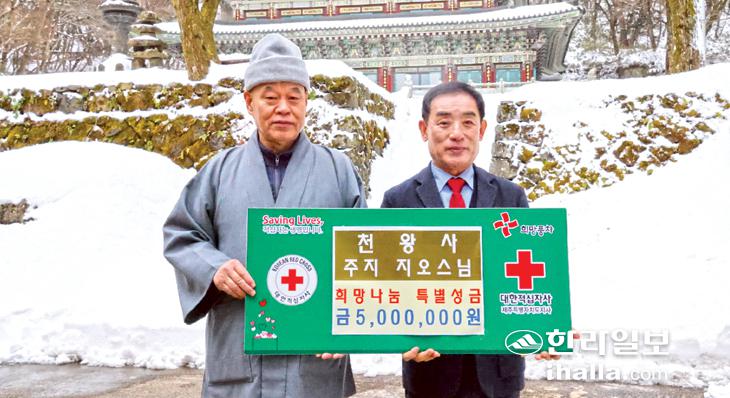 대한불교조계종 한라산 기도도량 천왕사(주지 지오 스님)는 최근 천왕사 앞마당에서 대한적십자사제주특별자치도지사(회장 오홍식)에 희망나눔 특별성금 500만원을 전달했다. 이번 성금은 연말연시 소외된 이웃에 온정을 전하기 위해 마련됐으며 위기가정 긴급지원, 희망풍차 결연 등에 사용될 예정이다.