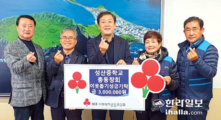 성산중학교총동창회(회장 고관범)는 지난 6일 성산읍주민센터를 방문해 새해를 맞아 지역사회의 소외되고 어려운 이웃을 위해 써달라며 이웃돕기 성금 300만원을 기탁했다.