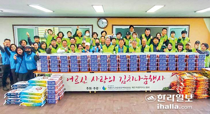 저출산고령화정책위원회제주특별자치도협회(회장 조영기)는 지난 7일 회원 60여 명이 참석한 가운데 어르신 사랑의 김치나눔 행사를 진행했다. 이날 준비한 김치는 지역 내 복지시설에 전달됐다.