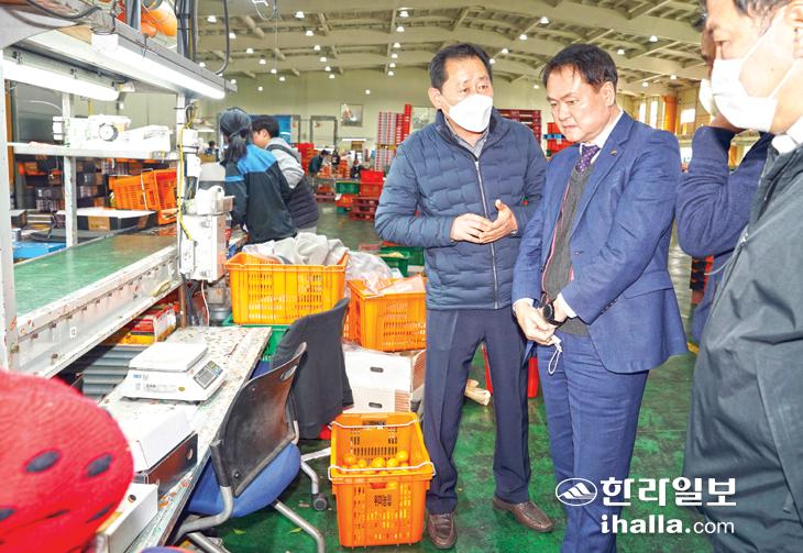 김희현 제주도 정무부지사는 9일 설 명절 특수를 맞아 서귀포시의 위미농업협동조합(조합장 권한대행 오영종) 하례거점산지유통센터를 방문해 감귤 선별·가공시설 운영 상황을 점검하고 관계자들을 격려했다. 김 부지사는 "감귤산업 발전을 위해 현장의 목소리를 더욱 적극적으로 정책에 반영해 나가겠다"고 말했다.