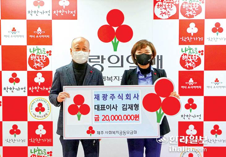 김재형 재광주식회사 대표는 지난 10일 제주사회복지공동모금회(회장 강지언)를 방문해 도내 어려운 이웃들 돕는데 사용해달라며 성금 2000만원을 기부했다.