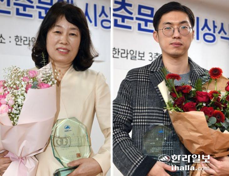 왼쪽부터 시상식에 참석한 신춘문예 수상자 장현숙, 김동승씨.