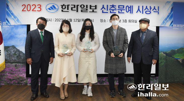 12일 한라일보 3층 대회의실에서 2023 한라일보 신춘문예 시상식이 열렸다. 왼쪽부터 김건일 한라일보 대표이사, 신춘문예로 문단에 데뷔한 장현숙 시인, 김미진 시조시인을 대신해 대리수상한 딸 김가영씨, 김동승 소설가와 시 부문 본심을 맡은 심사위원 김병택 문학평론가가 기념촬영을 하고 있다. 이상국기자
