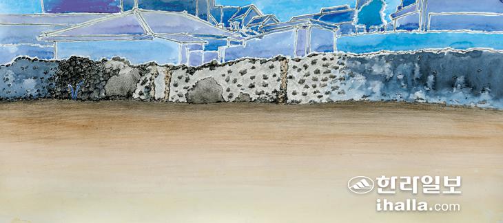 주제를 부각하기 위하여 가끔 이런 스타일의 그림이 부득불 필요할 때가 있다. 무대에서 모두 떠들면 그건 공연이라고 할 수 없는 이치와 같다고나 할까. 집담 뒤에 건물들은 판화적 개념으로 단색화 처리하여 주인공의 메시지 전달 위치를 설명하는 역할로 단순화시켰다. 함덕리 주민이라면 뒤에 보이는 집들의 외곽선만 보고도 대충 위치를 짐작할 것이다. 이 큰 마을 구석구석을 걸어 다니며 의미 있는 풍경을 찾다가 길가에 잇닿은 집터 공간. 철거가 이뤄진 상태다. 하지만, 집담이 있던 흔적은 그대로 남아 지난 세월의 타임캡슐이 돼주고 있는 것. 시멘트가 서민들의 생활에 쉽게 다가갈 수 있게 된 1970년대 초 이전, 흙으로 돌틈을 막으며 쌓았던 초가 벽의 흔적이 벽이었던 곳 속에 보이고 있다. 최소 두 세대 전에 있었던 초가집 벽에 시멘트를 바르고, 필경 지붕을 개량해서 살았을 것이다. 저 집에서 뛰놀던 아이들은 지금 어디서 무엇을 할까? 놀라운 것은 두 개의 커다란 바위가 건물 벽과 함께 하고 있는 것이다. 같이 힘을 모아야 운반과 이동이 가능했을 그 무게. 마치 동양화의 여백처럼 집터이자 마당을 화면 가득 여운으로 남겼다. 농도에 의한 원근감으로 공간미를 충족시키고. 건물은 그 자체로 하나의 역사다. 그렇다면 이 풍경속에 있었던 건물은 가족사가 되는 것이다. 이 공간을 그냥 놔두지 않을 터. 다시 어떤 새로운 역사가 지어지나? 끊임없이 발전하는 함덕리의 오늘을 과거 속에서 그리려 하였다.