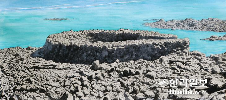 아이러니란 이런 것, 눈부시게 밝은 모래 해변에 현무암은 상대적으로 어두워야 함에도 오히려 태양광선의 내리쬐는 강도를 몇 배 더 증폭시켜준다. 그 실증적 풍광이 여기다. 용암이 흘렀던 모습을 그대로 보여주는 투뮬러스 지대에 용천수가 솟아나고 있음을 발견한 옛 함덕리 조상들은 생존에 필요한 식수원으로 활용하였을 것이다. 이 귀한 물을 보호하기 위하여 돌담을 견고하게 쌓고. 해변 풍광과 함께 하는 그 모습이 너무도 매력적이다. 어떤 치장도 없고 그냥 현실적인 선택에 의한 실용적 단순미. 자세히 보면 파도의 위력을 실감하게 된다. 화면 왼쪽 파도가 밀려오는 곳에는 용암의 흐른 자국이 확연한 암반이고 오른쪽은 깨져서 밀려난 돌들이 널려 있는 상황이다. 모를 일이다, 수 백 년 전에 저 용천수 주변에 쌓여 있던 돌들이 파도에 무너져 널려있는 것은 아닐까? 바닷물과 만나 옥색 바다를 만드는 모래. 거기에 정오의 햇살을 받는 현무암. 그 속에서 솟아나는 용천수. 제주섬 해변의 숱한 바닷가 담수원들이 있으나 이런 배경색과 대비되어 시각적 풍요를 형성 할 수 있는 곳은 없다. 다양한 가치가 충돌하는 시대에 풍경이 가지는 차별성은 또 하나의 소중한 미의식으로 다가온다. 해수욕장이라는 공간 속에 마치 하나의 조형물처럼 조상들의 역사성을 보여주는 저 둥근 물공동체 울타리를 그리려 하였다. 작은 소망이 있다면 원형을 유지한 상태에서 다양한 포토존의 역할을 지닐 수 있도록 출중한 사진작가들의 노력이 있었으면 좋겠다.