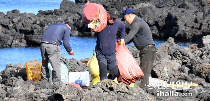 바다환경지킴이 해양정화활동 12일 제주시 구좌읍 하도리 해안에서 바다환경지킴이들이 해양정화활동을 하고 있다. 강희만기자