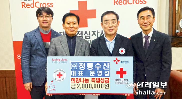 (주)청룡수산(대표 문영섭)은 지난 11일 대한적십자사제주특별자치도지사(회장 오홍식)를 방문해 희망나눔 특별성금 200만원을 전달했다.