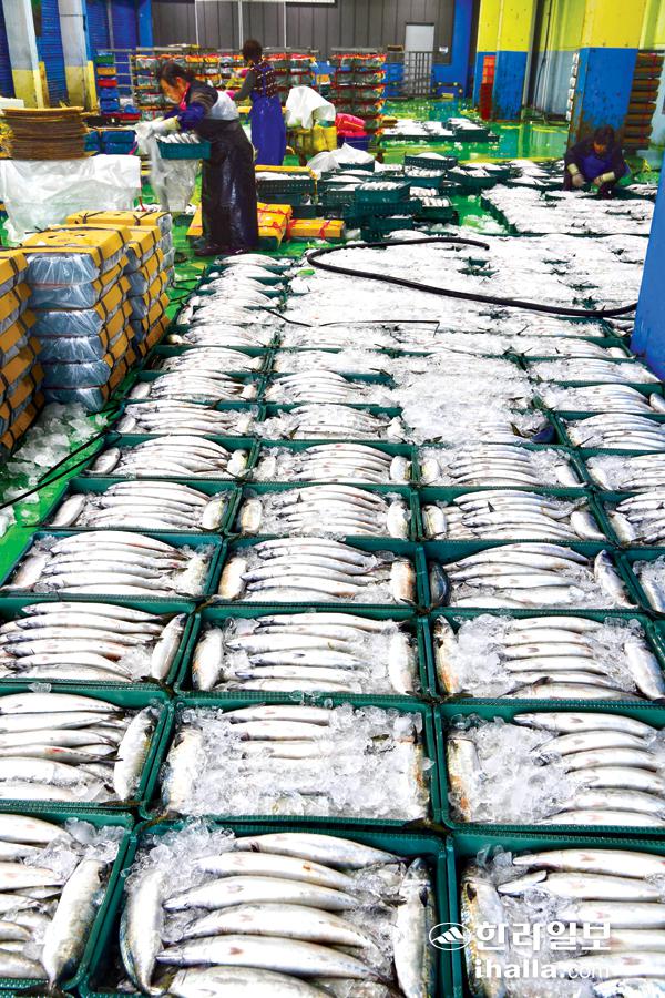 14일 제주시 한림읍 한림수협 어판장에서 어민들이 경매를 마친 신선한 고등어 포장 작업을 하고 있다. 강희만기자