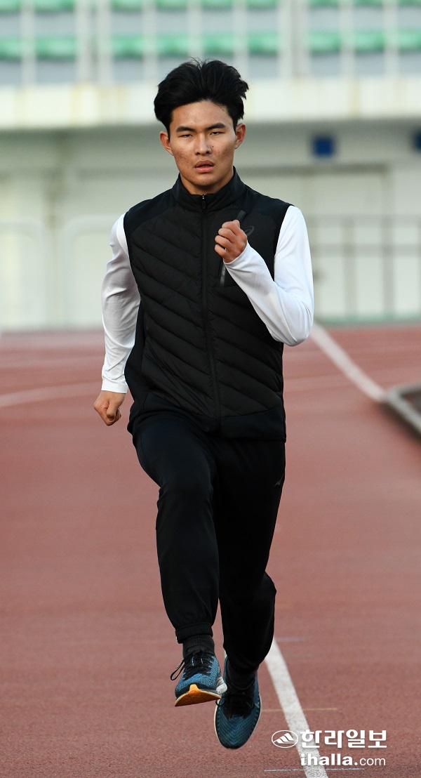 제주도 육상 단거리의 기대주인 고재혁이 제주종합경기장 주경기장에서 동계훈련을 하고 있다. 사진 강희만 기자
