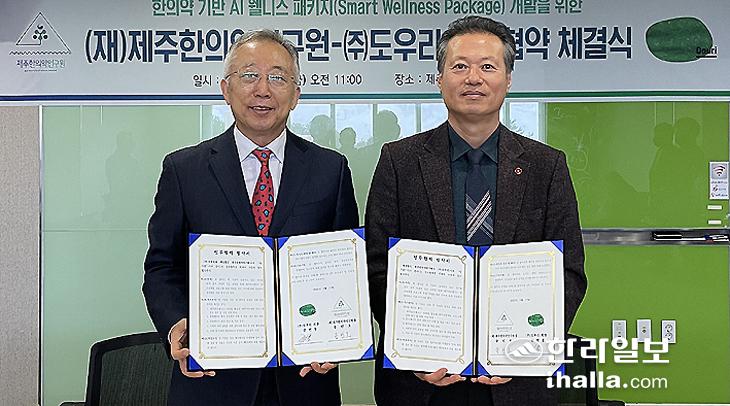 재단법인 제주한의약연구원(원장 송민호)과 주식회사 도우리(회장 문현봉)는 지난 13일 주식회사 도우리가 구좌읍 동복리 산1번지 일원에 추진 중인 '제주자연체험파크'의 한의학 AI 기반 '스마트 웰니스 패키지' 개발을 위한 업무협약을 체결했다.