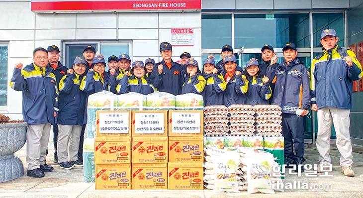 제주동부소방서 성산119센터(센터장 임태진)와 성산읍의용소방대(대장 김법수·홍재영·이충흡·김연자)는 최근 설 명절을 앞두고 홀로 사는 어르신 등 생활 형편이 어려운 이웃 28가구를 대상으로 쌀과 계란 등 150만원 상당의 생필품을 전달하며 위로했다.
