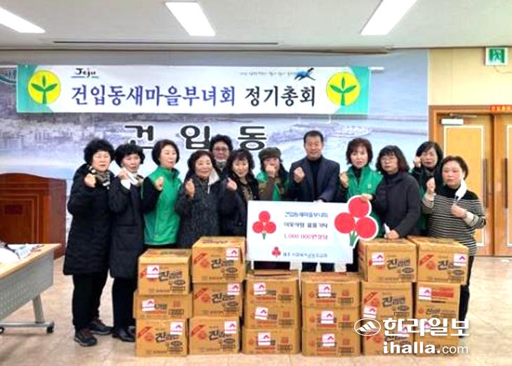 제주시 건입동새마을부녀회(회장 문명선)는 지난 13일 설을 맞아 복지 사각지대 해소 및 관내 저소득층 가정을 지원하기 위해 계란, 라면 등 100만원 상당의 물품을 기탁했다.