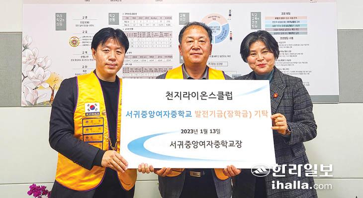 서귀포천지라이온스클럽(회장 김승주)은 지난 13일 서귀중앙여자중학교(교장 강연심)에 학교발전기금(장학금) 100만원을 기탁했다. 서귀중앙여중은 "어려운 환경에서도 바른 인성과 꿈을 이루기 위해 노력하는 학생을 선정해 장학금을 전달할 예정"이라고 했다.