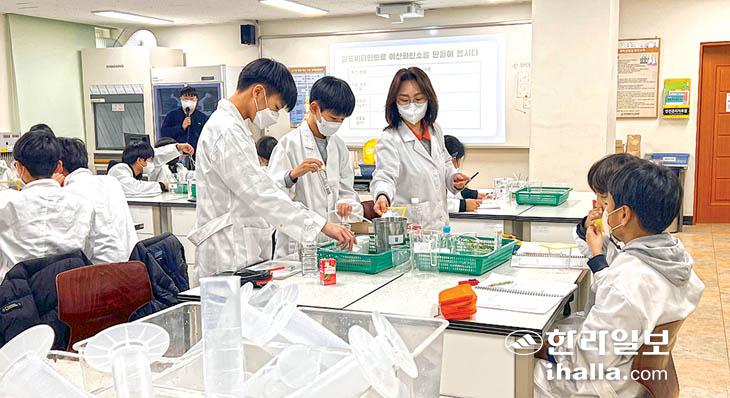 제주미래교육연구원(원장 고용철)이 주관하는 '2023 초등 과학실험캠프'가 이달 12일부터 17일까지 오름중, 동여중, 한라중, 서귀포중 등 4개교에서 분산 운영되고 있다. 이번 캠프는 '우리 생활 속 이산화탄소', '전기와 전지' 두 개 주제로 초·중·고 과학 교사를 강사로 위촉해 탐구 실험의 기초부터 산출물 제작까지 체험할 수 있도록 구성했다.