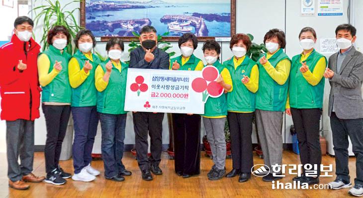 제주시 삼양동새마을부녀회(회장 양혜숙)는 지난 13일 삼양동주민센터(동장 오봉식)에서 설맞이 이웃사랑 성금 200만원을 제주사회복지공동모금회(회장 강지언)에 기탁했다. 삼양동새마을부녀회는 지난해 1월에도 떡국떡과 재활용품 판매를 통해 마련한 수익금 200만원을 기탁한 바 있으며 이번 성금은 삼양동주민센터를 통해 관내 저소득가정에 전달될 예정이다.
