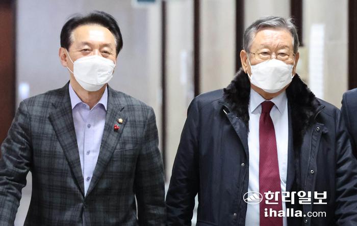 국민의힘 유흥수 선거관리위원장(오른쪽)과 선거관리부위이원장인 김석기 사무총장이 3일 국회에서 열린 전당대회 선관위원회 2차 회의에 참석하고 있다. 연합뉴스