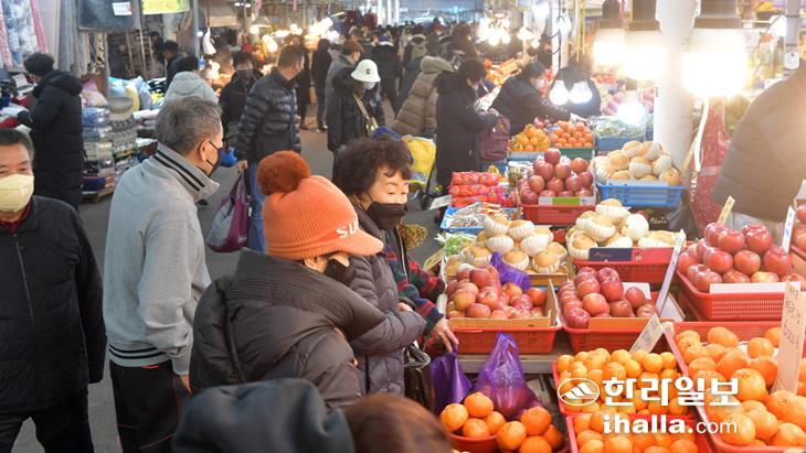 설 명절 전 마지막 제주시민속오일시장이 열린 17일. 코로나19 대유행 이후 3년만에 사회적 거리두기 없는 설을 앞두고 오전부터 제수용품을 장만하려는 이들의 발길로 시장은 북적였다.