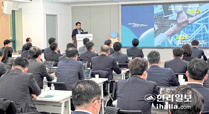 제주은행(은행장 박우혁)은 지난 17일 변화추진조직(영리더 그룹) 직원 등 60여 명이 참석한 가운데 '2023년도 상반기 경영전략회의'를 개최했다. 회의에선 올해 목표 달성을 위한 세부 전략과 지원방안을 공유하고 지역본부별 아젠다 토론 발표를 통해 현장 중심의 전략과 실행 방안을 논의했다.
