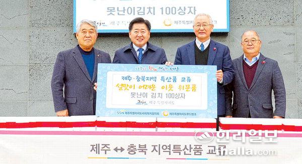 제주도는 17일 제주시 화북동 소재 제주도 광역푸드뱅크 물류센터에서 충북에서 생산한 못난이김치 전달식을 개최했다.