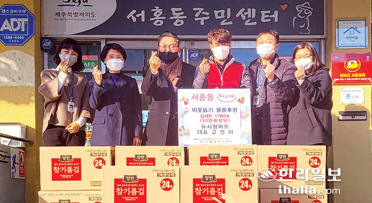 서귀포시 서홍동 소재 뉴시청마트(대표 고영아)는 지난 17일 서홍동주민센터를 방문해 설날을 맞아 어려운 이웃을 돕는데 사용해 달라며 김세트 17박스(50만원 상당)를 기탁했다.