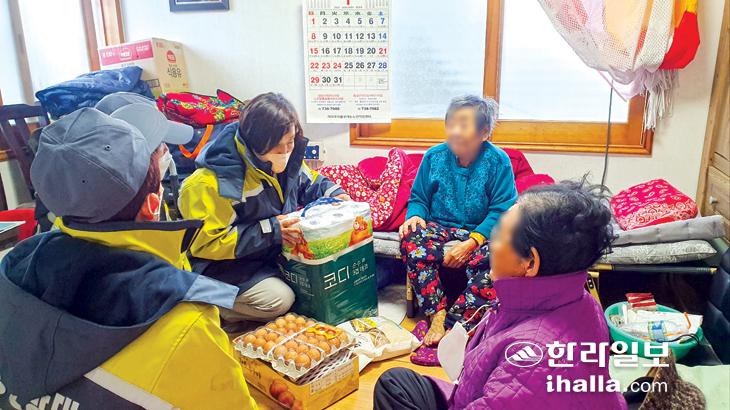 성산여성의용소방대(대장 홍재영)는 최근 성산읍에 홀로 사는 어르신 가구를 방문해 쌀, 고구마, 화장지, 계란 등 식료품과 생필품을 전달하고 어르신의 안부를 확인했다.