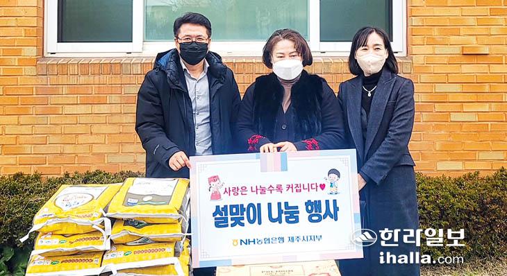농협제주시지부(지부장 이춘협)는 18일 명절을 맞아 도내 사회복지시설 성심원, 힘찬노인복지센터, 성가정노인복지센터등을 방문해 쌀과 과일 등 각각 50만원 상당의 물품을 전달했다.