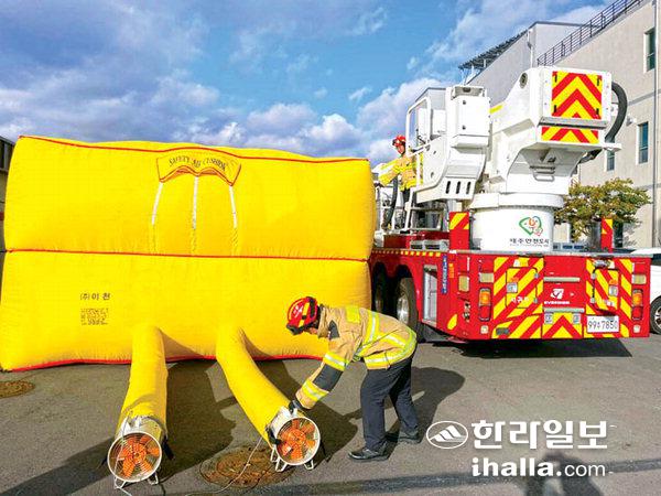 서귀포소방서 대신119센터(센터장 김영진)는 최근 추락사고 방지와 신속한 인명구조 활동을 위한 에어매트 훈련을 실시했다. 이번 훈련은 에어매트 작동상태 점검과 전개 시 주의사항, 안전사고 방지 교육 등 실제 현장 상황을 가정해 진행됐다.