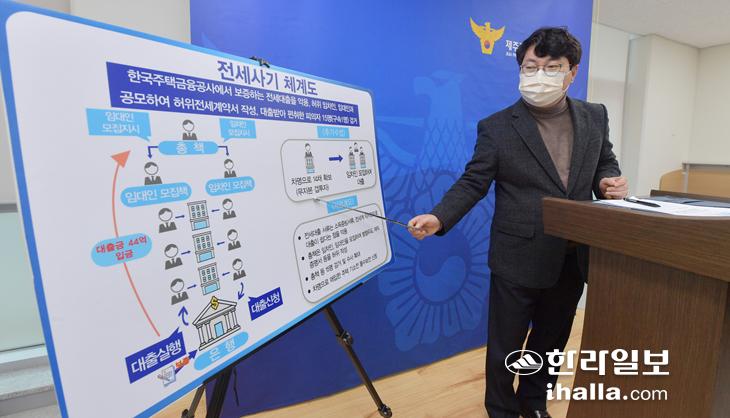 김항년 제주경찰청 반부패경제범죄수사대장이 19일 기자실에서 전세대출 사기 사건에 대해 브리핑을 하고 있다. 이상국 기자