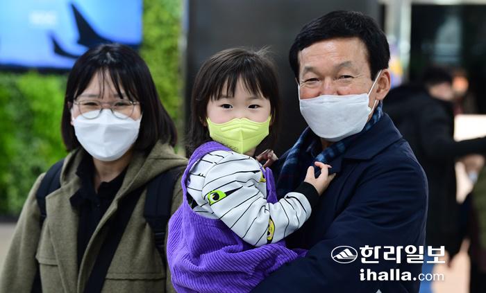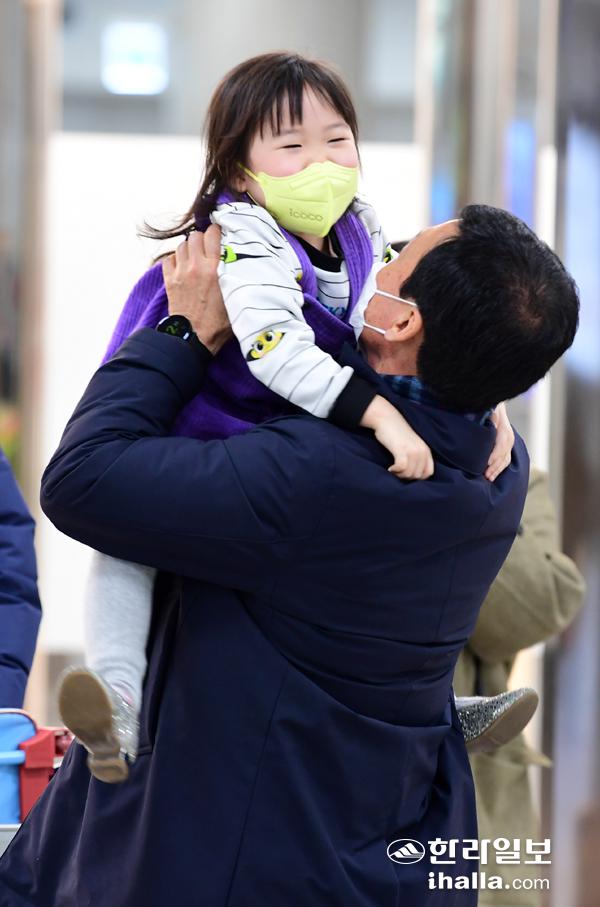 민족 고유 명절인 설날을 사흘 앞둔 19일 제주국제공항 국내선 도착 대합실로 마중을 나온 할아버지가 오랜만에 만나는 손녀를 안아주며 반갑게 맞이하고 있다. 강희만기자