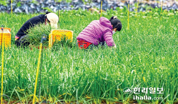 쪽파 수확하는 농가19일 제주시 한림읍 수원리 한 농경지에서 농민들이 쪽파 수확 작업을 하고 있다. 강희만기자