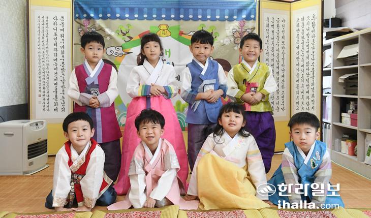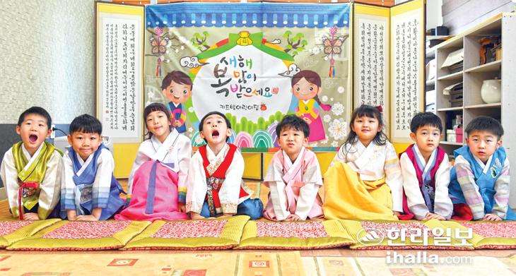 설날을 앞둔 19일 제주시 키즈빌어린이집 원생들이 새해 인사를 하고 있다. 이상국기자