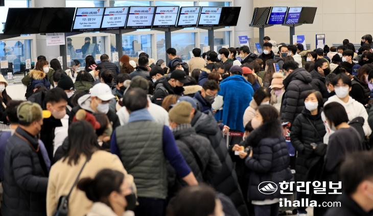 설 연휴 마지막 날인 24일 오전 폭설과 강풍이 몰아쳐 항공편이 전편 결항한 가운데 승객들이 대기표를 구하기 위해 각 항공사 대기전용 카운터에 길게 줄을 서 있다. 연합뉴스