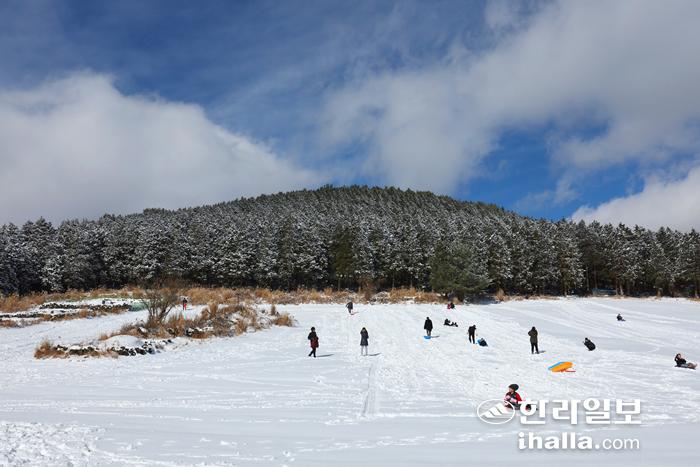 25일 오후 제주시 연동 노루손이오름 앞 눈밭을 찾은 이들이 겨울 정취를 즐기고 있다. 연합뉴스