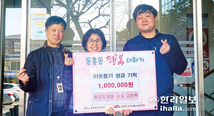 주식회사 건도개발(대표 고민혁)은 지난 20일 동홍동주민센터를 방문해 설 명절을 맞아 도움의 손길이 필요한 이웃들을 위해 사용해달라며 성금 100만원을 기탁했다.