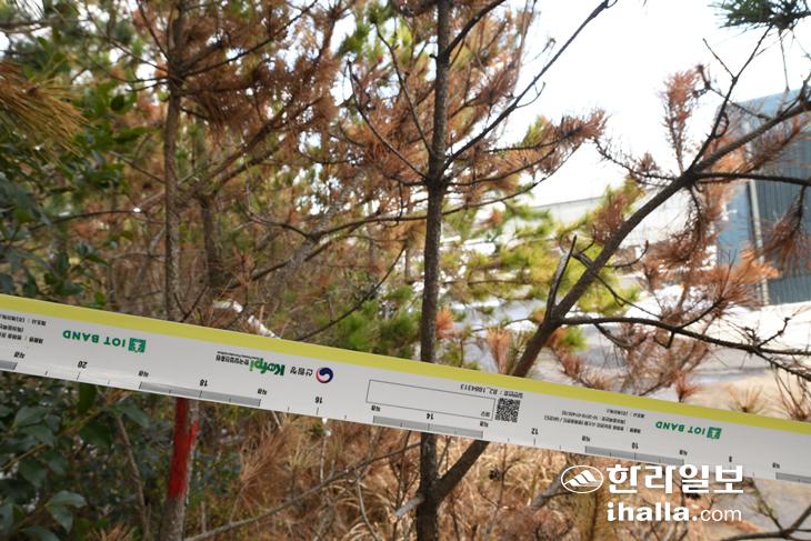 지난 25일 찾은 제주시 한경면 낙천리의 한 비닐하우스 농장. 농장 주변에 있는 소나무마다 QR코드가 찍힌 '병해충 밴드'가 부착돼있다. 병해충 밴드가 부착된 소나무들은 한결같이 푸르름을 잃은 채 누렇게 입이 변해 말라 죽어있었다. 농장 주변에서 이렇게 말라 죽은 소나무가 10여 그루다.