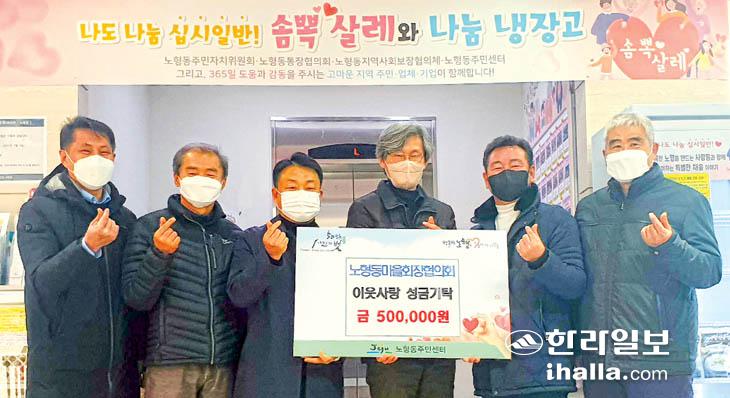 제주시 노형동 마을회장협의회(회장 현상진)에서는 지난 25일 노형동주민센터(동장 김신엽)에 저소득 가구를 위해 이웃 사랑 성금 50만원을 기탁했다. 이날 기탁된 성금은 노형동 관내 장애인 등에게 전달될 예정이다.