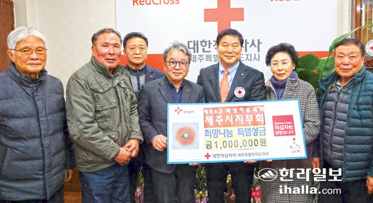 제주4·3희생자유족회 제주시지부회(회장 임계령)는 지난 25일 대한적십자사제주특별자치도지사(회장 정태근)를 방문해 소외된 이웃을 위한 희망나눔 특별성금 100만원을 기탁했다.