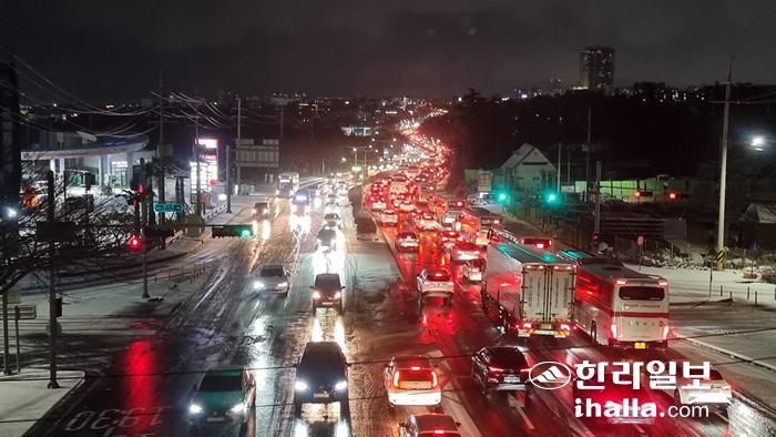 특히 퇴근시간에 갑작스레 많은 눈이 내리고 도로가 얼어붙으면서 제주시내 뿐만 아니라 평화로 등에서 극심한 교통 혼잡이 발생했다.