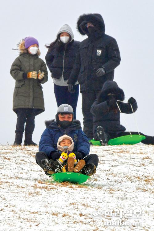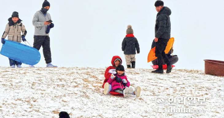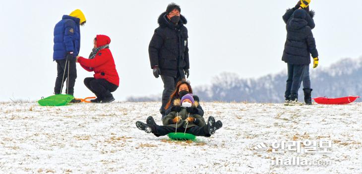 29일 제주시 봉개동 한 언덕에서 관광객들이 썰매를 타며 즐거운 한때를 보내고 있다. 이상국기자